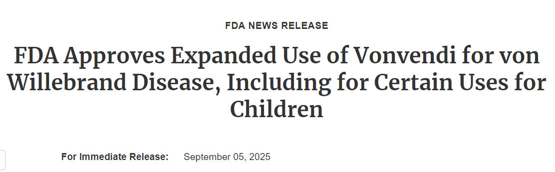 此前,Vonvendi仅被批准用于成人患者的出血事件和围手术期按需治疗,以及最严重的3型VWD成人的预防性使用。此次适应症扩展显著拓宽了该药的临床应用范围。