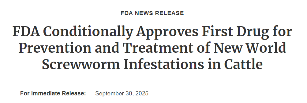 新世界螺旋虫幼虫侵扰是一种严重威胁牛群健康与畜牧业生产的寄生虫病。FDA此次通过"有条件批准"途径,在确保安全性和有效性预期的基础上,使该药得以快速投入使用。