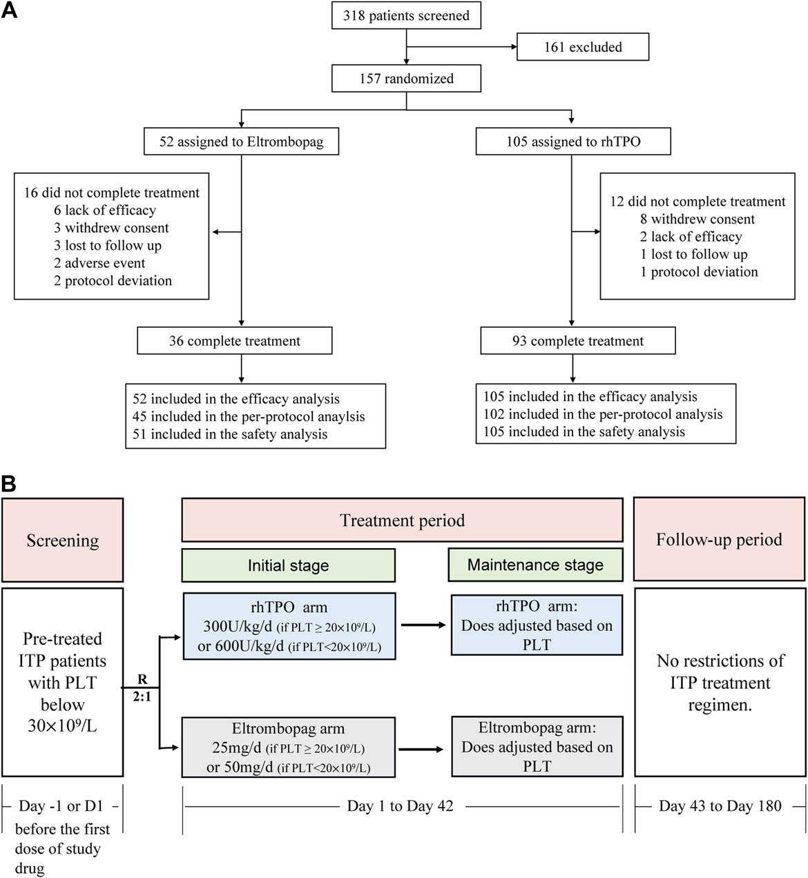 这项名为TE-ITP研究的多中心临床试验在中国12家医疗中心开展,共纳入157例病史超过3个月的成人ITP患者。研究采用随机、开放标签、阳性药物对照设计,患者按2:1比例分配至rhTPO组或艾曲泊帕组。