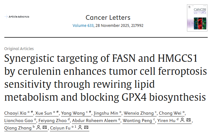 该研究通过高通量药物筛选技术,鉴定出一种能够显著增强肿瘤细胞铁死亡敏感性的化合物——Cerulenin,并系统揭示了其通过协同抑制FASN和HMGCS1双靶点、重构脂质代谢通路及阻断关键抗氧化酶合成的创新机制。这一发现为克服肿瘤铁死亡抵抗提供了全新的“一石二鸟”式治疗策略,具有重要的科学价值与临床转化前景。