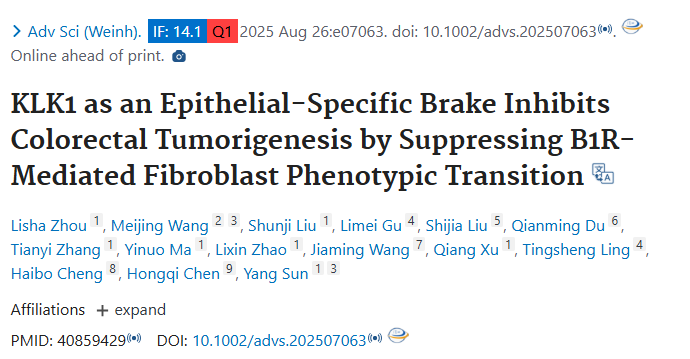 该研究首次系统揭示组织激肽释放酶1(KLK1)在结肠炎—结直肠癌转化过程中的关键保护作用,并阐明其通过调控成纤维细胞表型及细胞外基质重塑抑制肿瘤发生的分子机制。