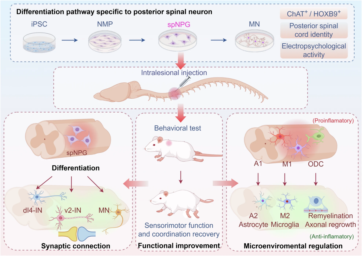 一方面,spNPG在体内分化为运动神经元(16%)、V2中间神经元(11%)和dI4中间神经元(29.4%)等关键神经细胞,重建神经环路。这些细胞能与宿主神经细胞形成突触连接,实现信号互通。