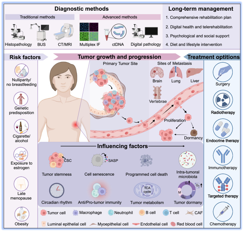 研究揭示了乳腺癌发生发展的多重机制,包括遗传改变、激素稳态改变、免疫干扰等。肿瘤干性、细胞衰老、新型程序性细胞死亡(铁死亡、铜死亡等)、肿瘤内微生物群等因素均在乳腺癌进展中发挥关键作用。