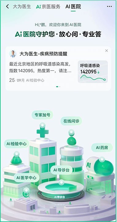 目前,"AI京医"系列智能体已累计服务超过1.5亿用户,服务满意度达97%。全科AI医生"大为"凭借可信推理能力和有温度的交互体验,用户规模和好评率持续上升。数据显示,AI问诊用户中69.42%来自三线及以下城市,有效促进了优质医疗资源向基层流动。