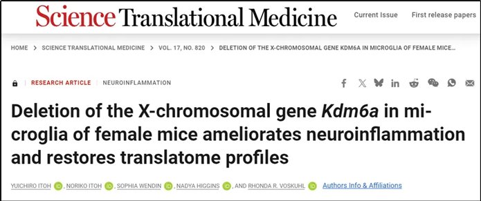 研究团队聚焦于大脑中的关键免疫细胞——小胶质细胞,发现在多发性硬化小鼠模型中,雌性个体小胶质细胞的基因失调程度显著高于雄性。进一步的机制研究揭示,KDM6A作为一种能够逃逸X染色体失活的X连锁基因,在雌性个体中的表达水平天然较高。