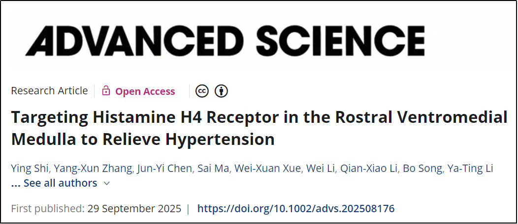 该研究工作以"Targeting histamine H4 receptor in the rostral ventromedial medulla to relieve hypertension"为题于2025年9月29日在《先进科学》在线发表。生命科学学院石莹博士、张洋浔博士、硕士研究生陈俊毅和博士研究生马赛为论文共同第一作者,朱景宁教授、张潇洋特聘研究员和于雷博士为共同通讯作者。