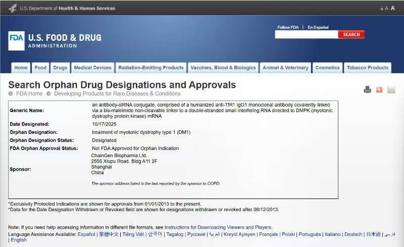 2025年10月17日,迦进生物医药(上海)有限公司宣布,其自主研发的TfR1抗体-siRNA偶联药物CGB1001,获得美国食品药品监督管理局(FDA)授予的孤儿药资格认定,用于治疗1型强直性肌营养不良。此举标志着中国在罕见病创新疗法领域实现了又一重要突破。