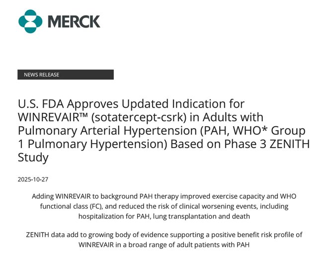 该药物是默沙东于2021年以115亿美元收购Acceleron Pharma所得的重要资产。继2024年3月首次获批用于II级或III级肺动脉高压患者后,此次适应症扩展标志着该药物在肺动脉高压治疗领域的又一次重大进展。