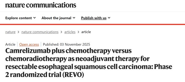 近日,由福建省肿瘤医院胸部肿瘤外科柳硕岩主任医师团队领衔开展的REVO研究在国际顶级期刊《Nature Communications》(影响因子15.7)在线发表。这项名为"卡瑞利珠单抗联合化疗对比术前放化疗作为可切除食管鳞癌的新辅助治疗"的II期随机对照试验,是全球首个在可手术局部晚期食管鳞癌患者中,头对头比较新辅助免疫化疗与新辅助放化疗疗效与安全性的临床研究。