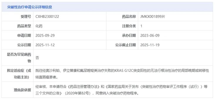 JMKX001899拟纳入突破性治疗药物程序,标志着国产KRAS G12C抑制剂研发再获重要进展。随着该药物在结直肠癌、非小细胞肺癌等多个适应症的持续推进,有望为国内KRAS G12C突变患者提供新的治疗选择,同时也展现了中国制药企业在创新药研发领域的持续突破。